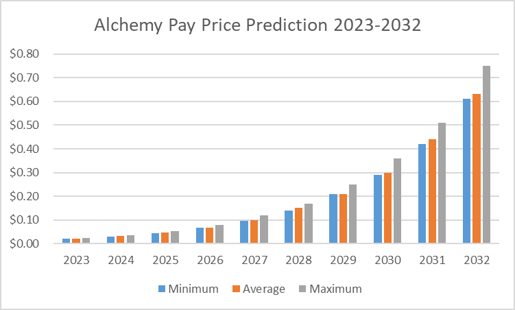 Le previsioni del prezzo di Alchemy Pay per il 2023 stimano che l'attuale prezzo di Alchemy Pay verrà scambiato a un prezzo di scambio minimo di $ 0,021, un valore medio di $ 0,022 e un prezzo di scambio massimo di $ 0,023.