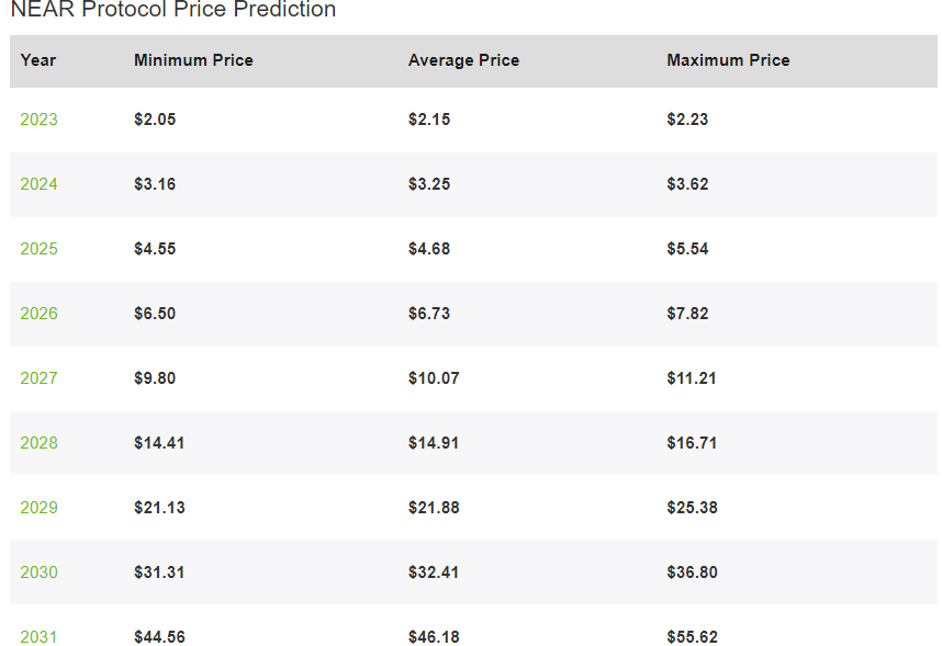 La previsione dei prezzi del protocollo NEAR per il 2023 stima che NEAR raggiungerà un prezzo minimo di $ 2,05, un valore medio di $ 2,15 e un prezzo massimo di $ 2,23.