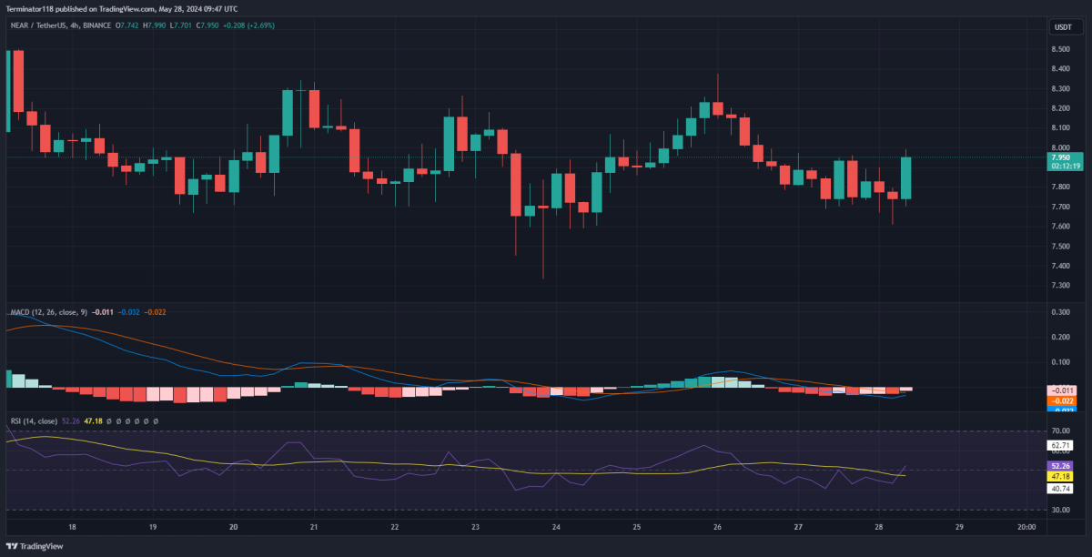 L'analisi dei prezzi Near Protocol per oggi, 28 maggio, mostra che il prezzo ha effettuato una rapida ripresa dalla soglia di $ 7,760 e che i rialzisti si muovono per incontrare nuovamente la resistenza di $ 8,00. Forte è la pressione d'acquisto, con un rialzo superiore al 2,69%. Il sentimento rialzista è stato alimentato dall’attività di acquisto da parte dei trader. Ciò ha permesso al token di rimanere al di sopra del livello cruciale di 7,50$ per la giornata.