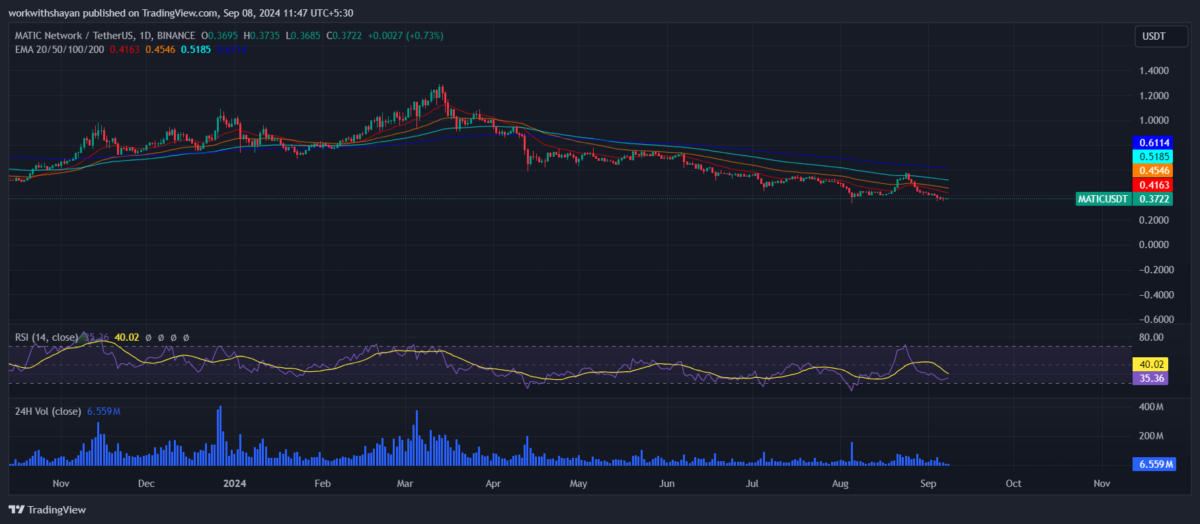 Analizzando il grafico dei prezzi giornalieri di Polygon, il prezzo di MATIC ha assistito a un rally ribassista dopo che gli orsi hanno spinto con successo l' altcoin al di sotto dei livelli immediati di Fib. Nelle ultime 24 ore, il prezzo MATIC si è consolidato intorno a $ 0,37 per una rapida ripresa; tuttavia, gli orsi dominano. Il volume nelle 24 ore è sceso a 6,5 ​​milioni di dollari, mostrando un calo di interesse per l'attività di trading odierna. Il prezzo MATIC è attualmente scambiato a $ 0,37, diminuendo di oltre lo 0,7% nelle ultime 24 ore.