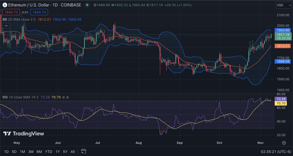 L'analisi dei prezzi di Ethereum per il 9 novembre 2023 mostra che ETH/USD viene scambiato sopra i 1.900 dollari dopo aver visto un impulso rialzista nelle ultime ore. I rialzisti stanno tentando di testare nuovamente il livello di resistenza di 1.950 dollari, ma c'è ancora una certa pressione ribassista. Al momento in cui scriviamo, ETH viene scambiato a 1.927 dollari, in rialzo del 2,57% nelle ultime 24 ore. La pressione rialzista è forte nella sessione di trading di oggi, con la maggior parte delle criptovalute scambiate in verde. Anche il token BTC è aumentato in precedenza, con il prezzo attuale che è salito sopra i 36.000 dollari registrando un guadagno in 7 giorni di oltre il 4%. Lo slancio rialzista nel mercato complessivo sta facendo salire i prezzi di ETH e sembra che Ethereum potrebbe essere diretto verso la resistenza di $ 2000, secondo l'analisi dei prezzi di Ethereum.