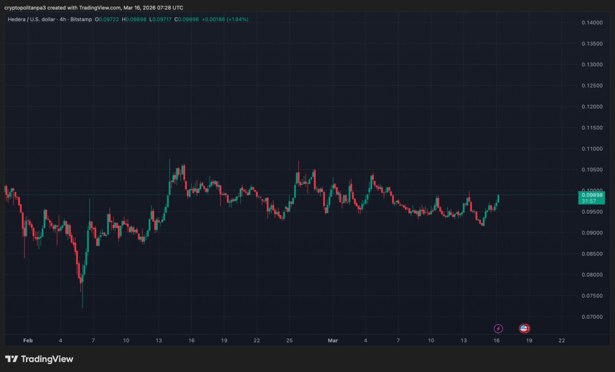 Sul grafico a 4 ore, Hedera (HBAR) mostra un momentum rialzista a breve termine dopo il rimbalzo dalla zona di supporto di $0,094. Il prezzo è gradualmente salito verso l'area di $0,099, formando minimi crescenti che segnalano una maggiore forza degli acquirenti. La struttura suggerisce una fase di consolidamento con una lieve pressione al rialzo dopo la volatilità di febbraio. La resistenza immediata si trova vicino all'intervallo $0,100-$0,102, che ha ripetutamente limitato i movimenti al rialzo. Una rottura al di sopra di questa zona potrebbe aprire la strada verso $0,105. Al ribasso, il supporto rimane intorno a $0,095 e $0,093. Se questo supporto regge, HBAR potrebbe continuare la sua lenta ripresa mantenendo un intervallo di trading ristretto nel breve termine.