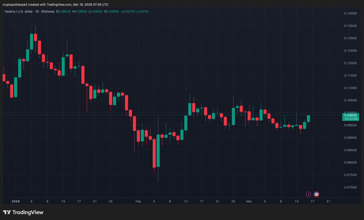 - Dall'inizio di febbraio al 16 marzo 2026, HBAR ha continuato a mostrare un trend ribassista, stabilizzandosi brevemente intorno a $0,066 prima di oscillare tra $0,062 e $0,065 con l'ingresso del mercato in una fase di consolidamento.